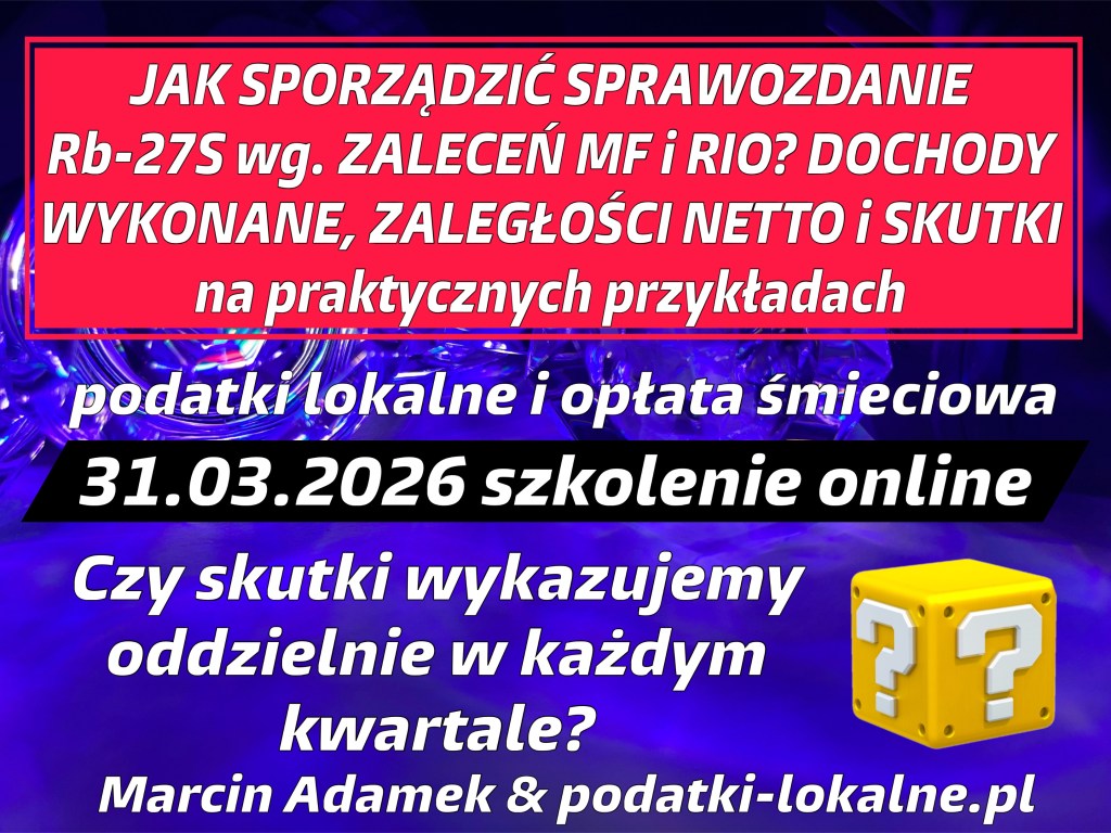 31.03.2026 JAK SPORZĄDZIĆ SPRAWOZDANIE BUDŻETOWE Rb – 27S wg. ZALECEŃ MINISTERSTWA FINANSÓW i RIO? DOCHODY WYKONANE, ZALEGŁOŚCI NETTO i SKUTKI na praktycznych przykładach – podatki lokalne i opłata śmieciowa. Liczba miejsc ograniczona!